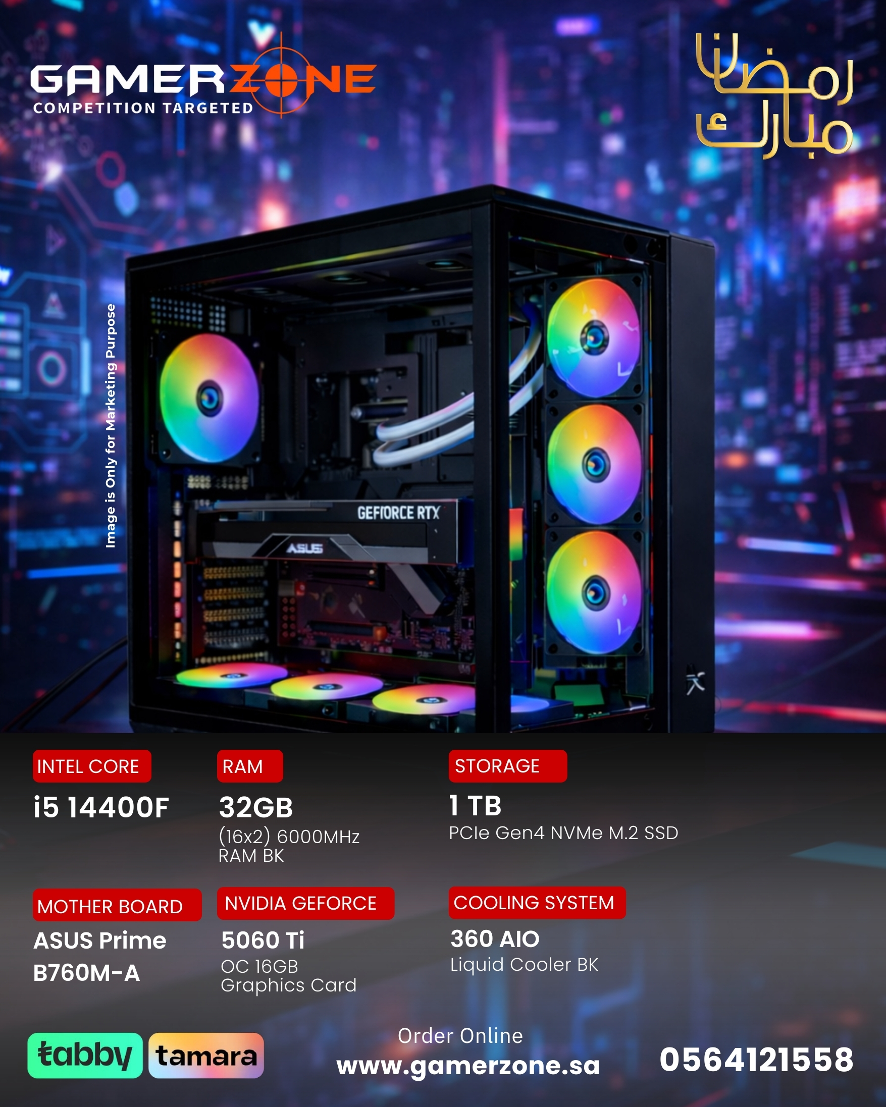 Powered by the Intel Core i5-14400F and the ZOTAC RTX 5060 Twin Edge 8GB GDDR7, this build offers fast, responsive gameplay with improved efficiency and strong graphics performance for modern titles.