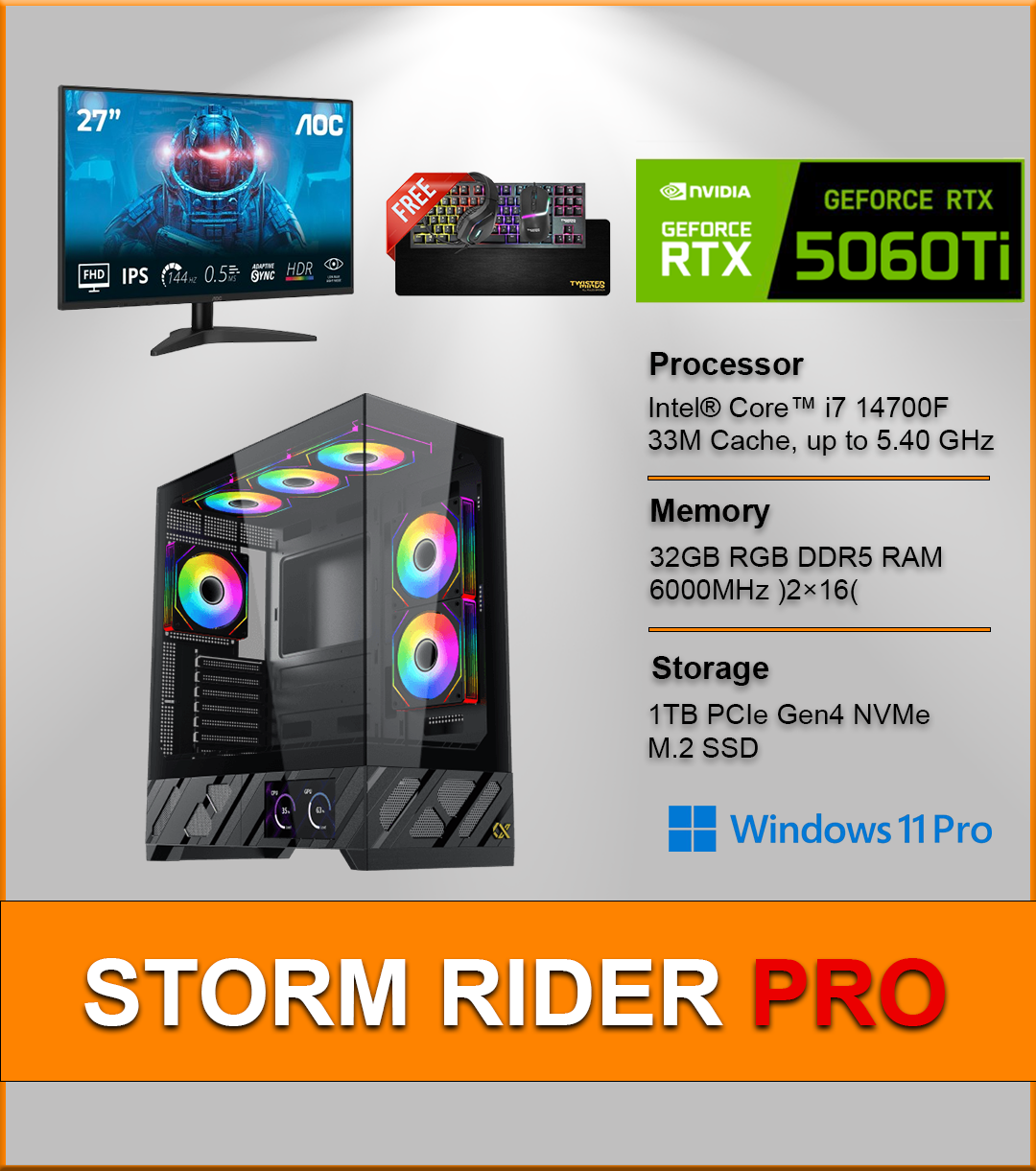 STORM RIDER PRO is a performance-focused gaming PC bundle built for competitive esports and demanding AAA titles. Powered by Intel Core i7-14700F and GeForce RTX 5060 Ti 16GB, it delivers ultra-high FPS, fast rendering, and smooth multitasking, paired with a next-gen AOC 27″ dual-mode monitor and premium RGB components for a clean, powerful gaming setup.