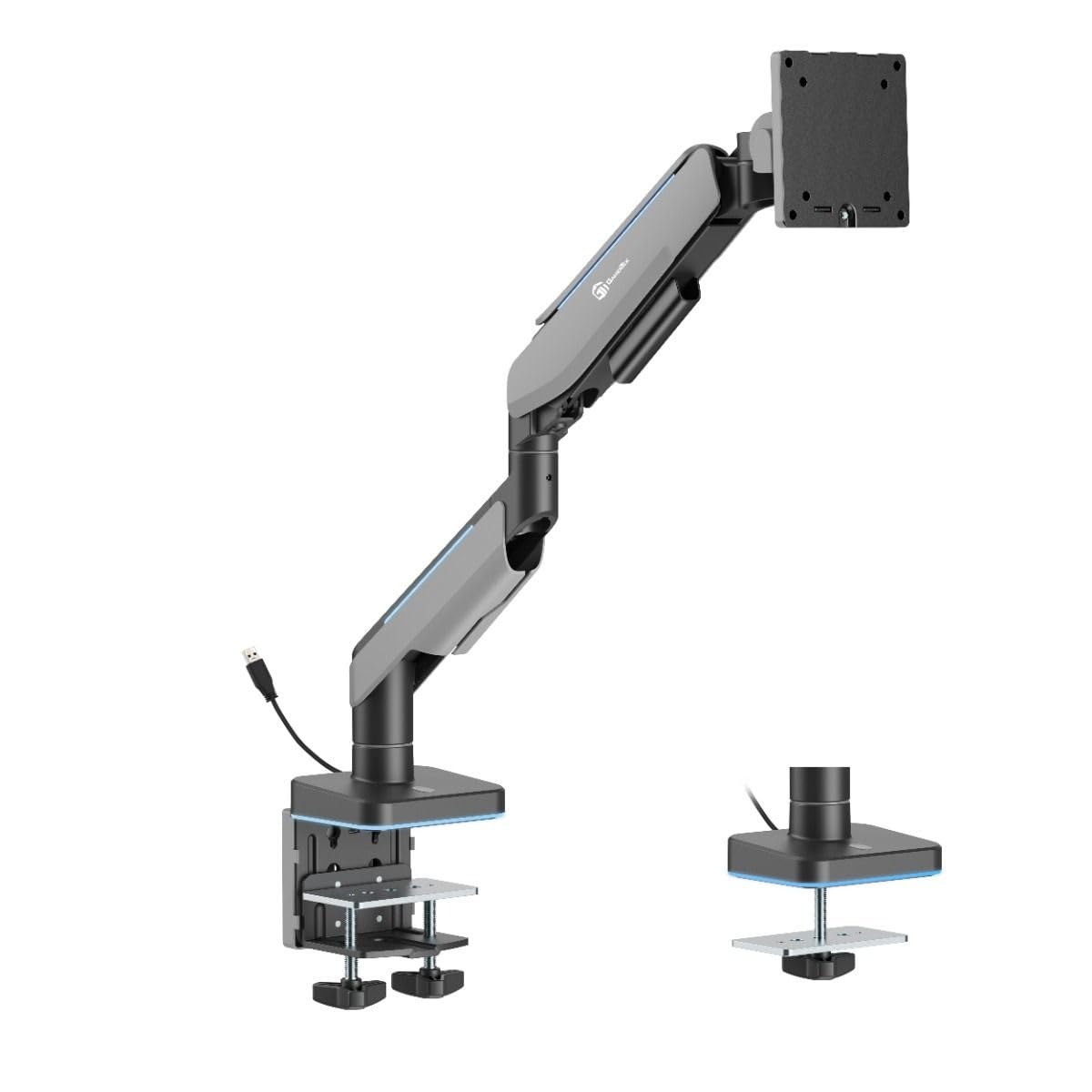 • Features: Gas-spring adjustment for height/tilt/swivel/pivot, full desk clamp / grommet mount compatibility