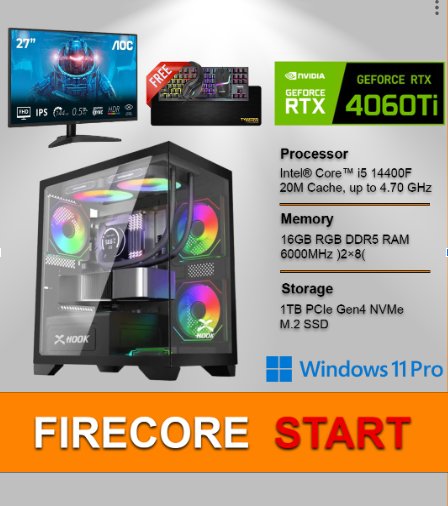 FIRECORE START is a solid entry-to-mid level gaming PC bundle built for smooth Full HD 144Hz gaming and everyday multitasking. Powered by Intel Core i5-14400F and RTX 4060 Ti, it delivers fast performance, clean visuals, and low latency, paired with DDR5 RGB memory, 1TB NVMe storage, Windows 11 Pro, and a complete AOC 27″ gaming monitor plus 4-in-1 gaming accessories—perfect for players who want power, value, and a clean RGB setup from day one.